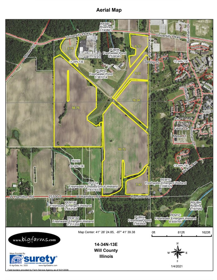 This 185 acre farm has a soil PI of 113.5 and is zoned R-1. The parcel is located less than 1 mile to the west of University Park, in Monee Township, Will County. The property is northeast Thorn Creek Headwater Preserve, is 1 mile west of Deer Creek Golf Course and 1 mile east of Governors State University.+ View Brochure