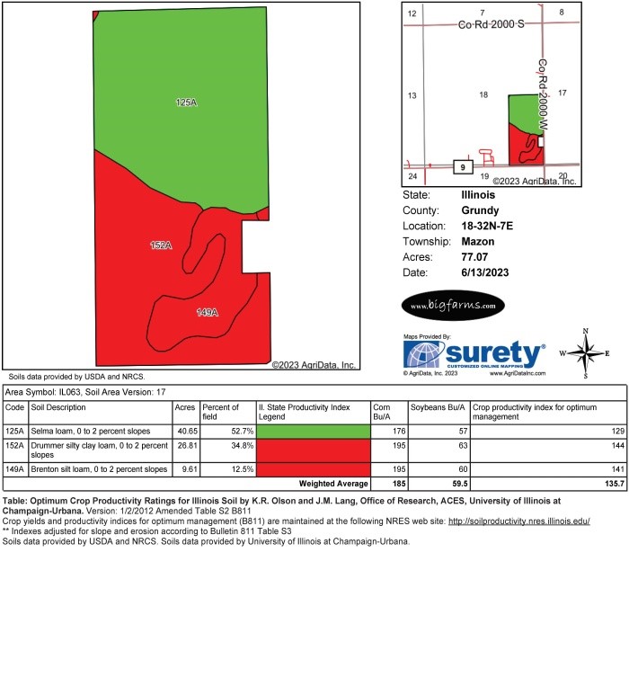 | Soil Type: | 52.7% Selma loam (125A) 34.8% Drummer silty clay loam (152A) 12.5% Brenton silt loam (149A) Please see Soil Map provided by Surety Maps for details. |